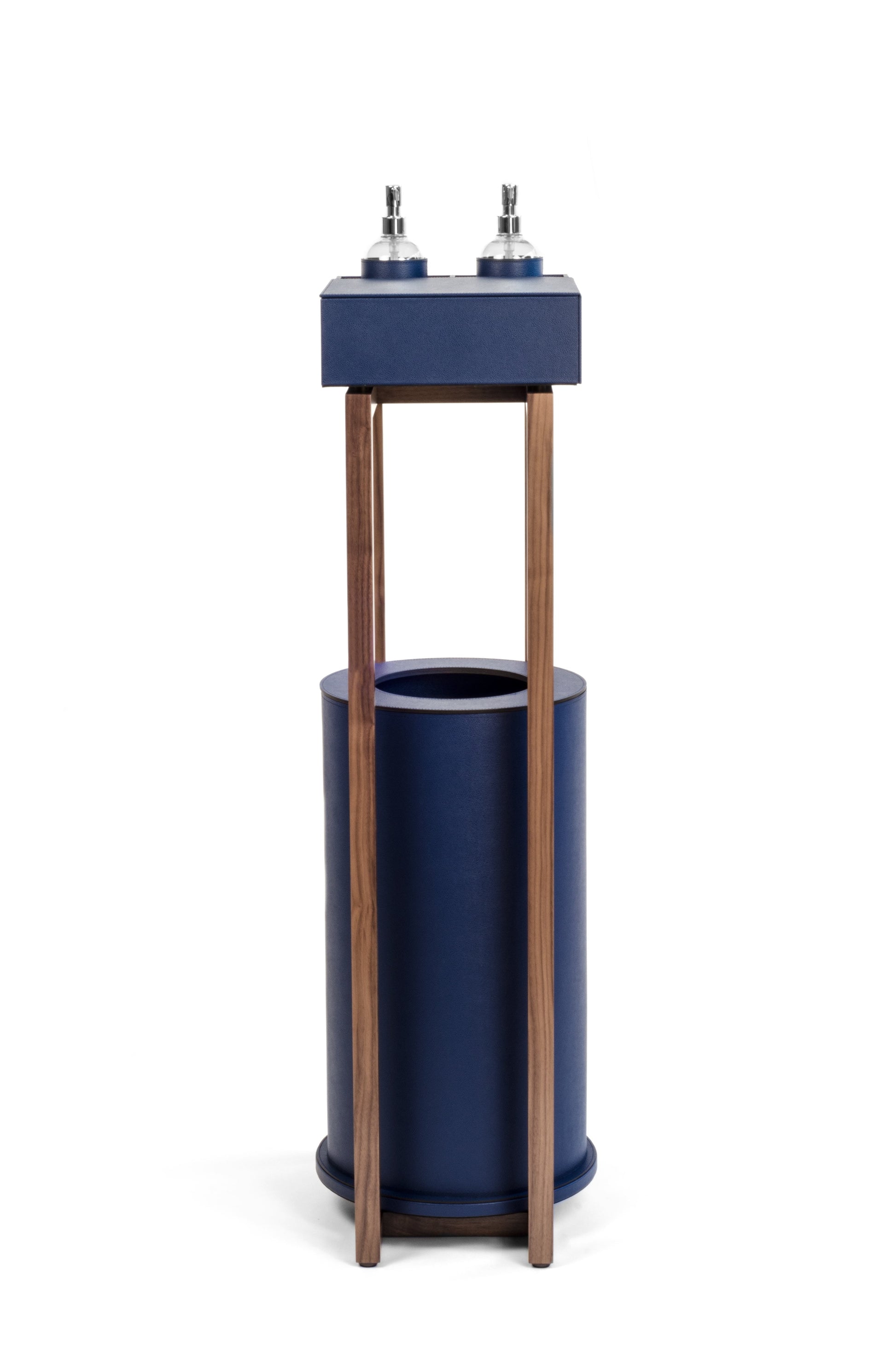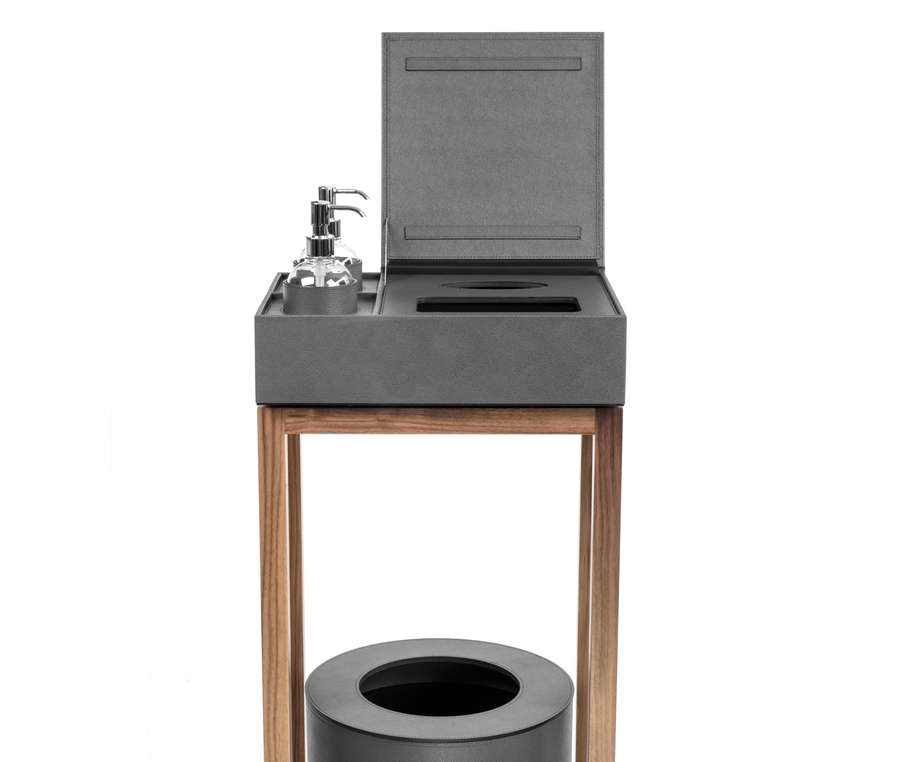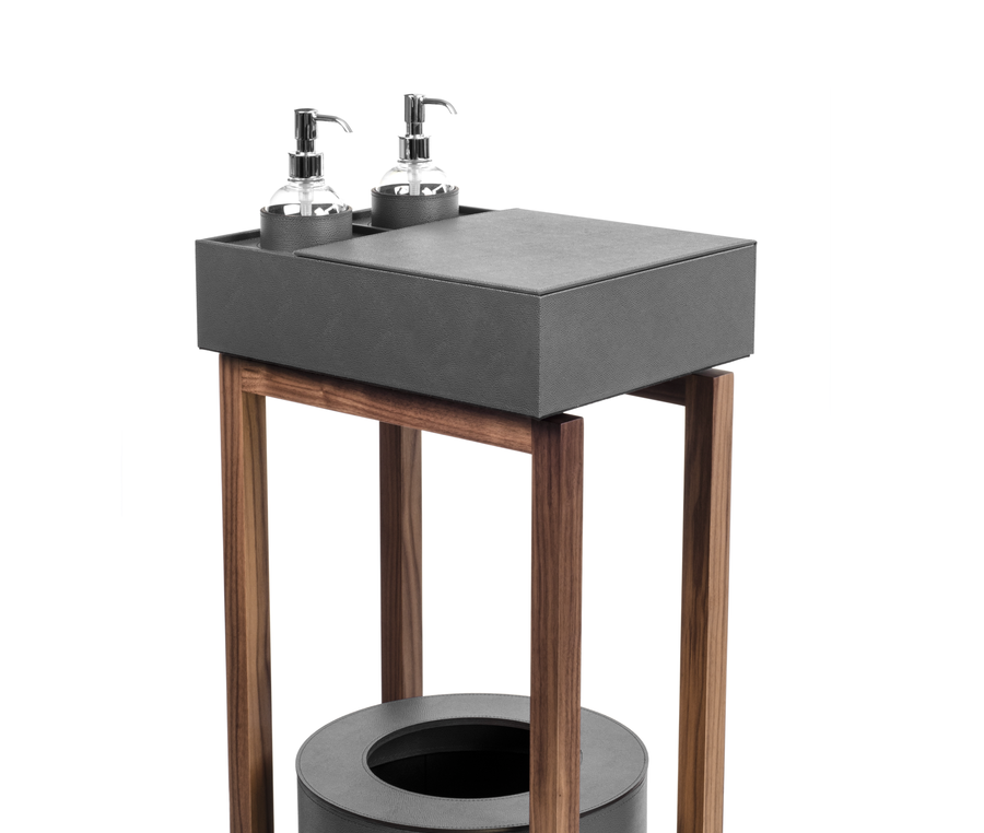 Une structure en bois de noyer équipée d'une boîte pratique pour ranger masques, gants ou mouchoirs et désinfectant pour les mains ensemble et complétée par une grande poubelle tout en cuir régénéré résistant.