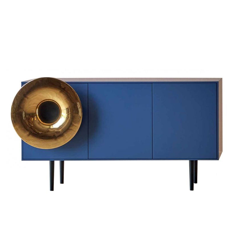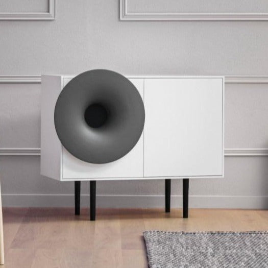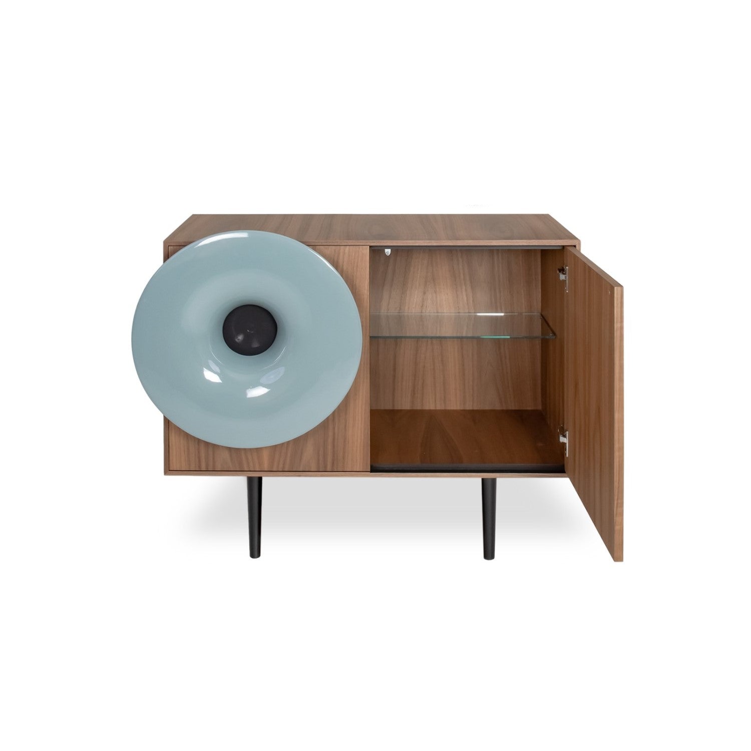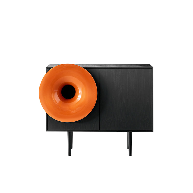 Le meuble Caruso est disponible en cinq finitions : laqué, noyer Canaletto, chêne thermo-traité, chêne flammé et chêne vintage. La trompette est en céramique et peut également être revêtue d'une finition céramique dorée 24 carats.
