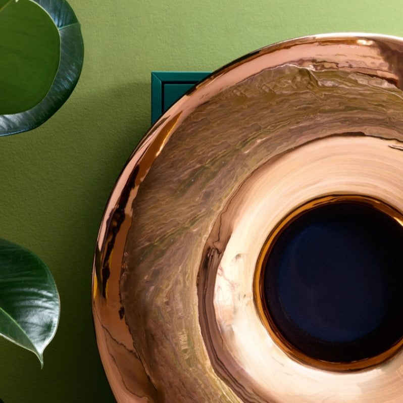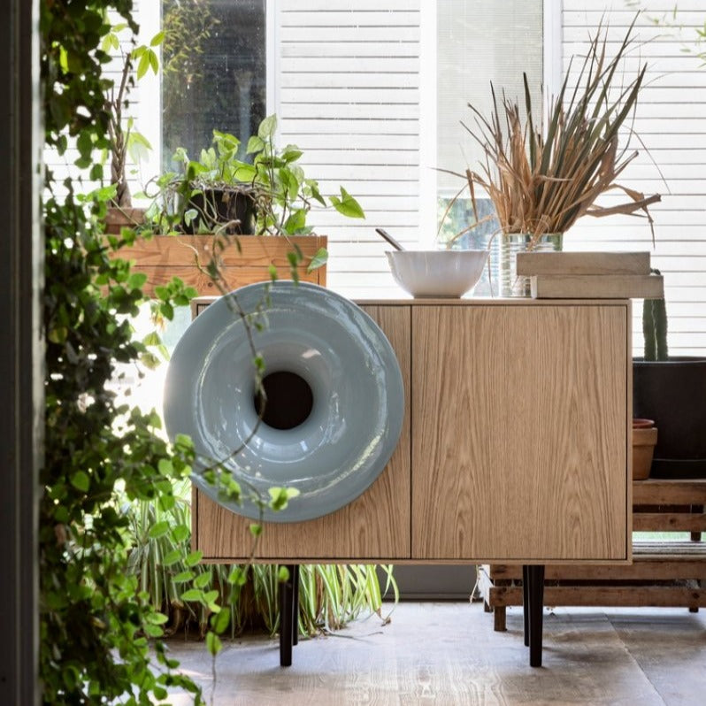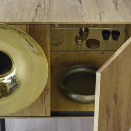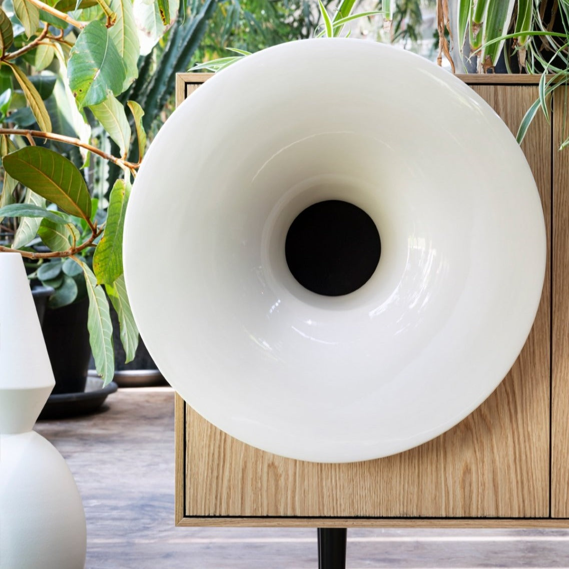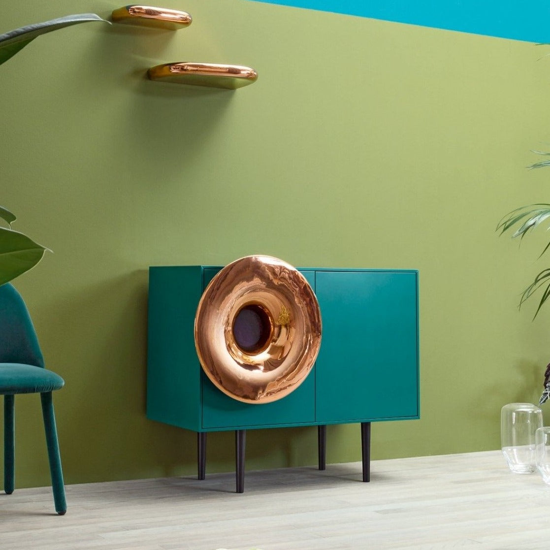 Le meuble Caruso est disponible en cinq finitions : laqué, noyer Canaletto, chêne thermo-traité, chêne flammé et chêne vintage. La trompette est en céramique et peut également être revêtue d'une finition céramique dorée 24 carats.