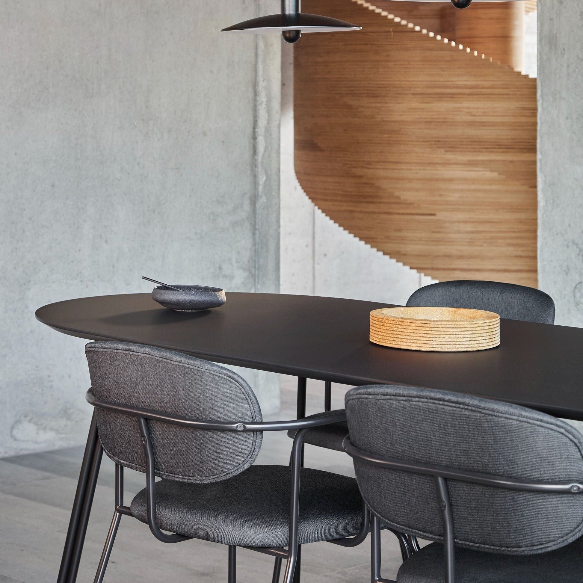 La chaise de salle à manger Frame est née de l'idée de concevoir une chaise comme on construit un petit bâtiment. Fortement inspirée des lignes rigoureuses des échafaudages des villes chinoises, elle met en valeur le moelleux du revêtement. Le dossier et l'assise, élégants, épousent les courbes du corps, offrant un confort d'assise optimal et une ambiance douce.