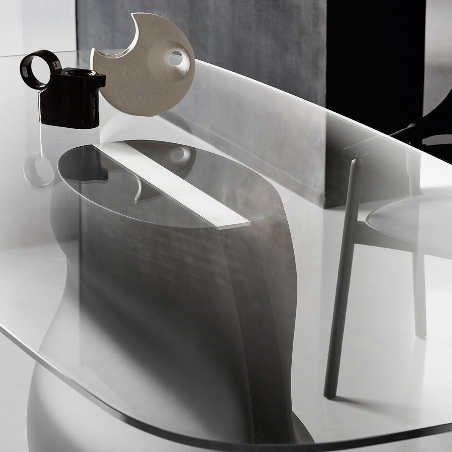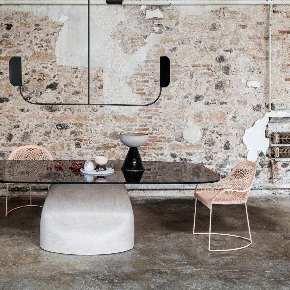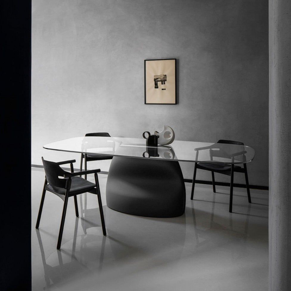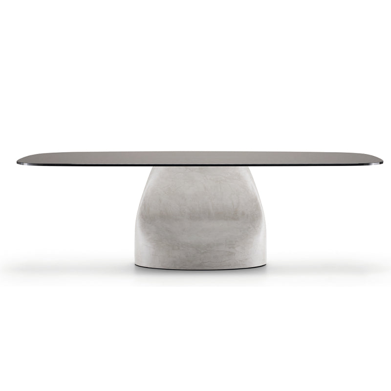 La table à manger Gran Sasso de Midj a été conçue par le designer italien Andrea Lucatello en 2018. Dans cette conception de table fixe, Lucatello utilise un polymère Baydur de forme organique comme matériau de base pour supporter un plateau en céramique ou en verre.