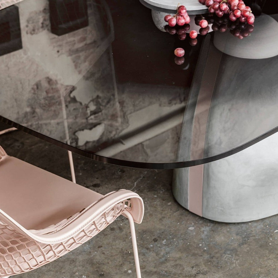 La base de la table est accentuée de manière unique verticalement avec d'étroites bandes de cuir italien conférant au Gran Sasso une esthétique très chic.