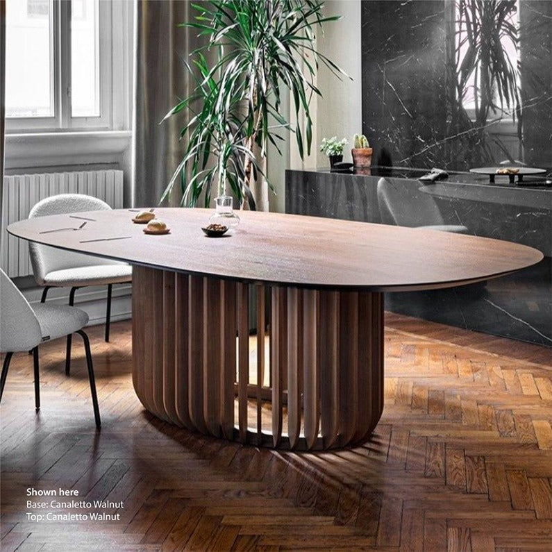 La table Juice est disponible en différentes tailles, entièrement réalisée en bois ou avec un plateau en céramique.