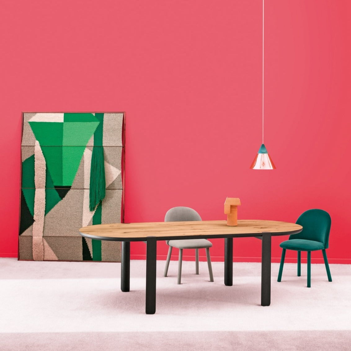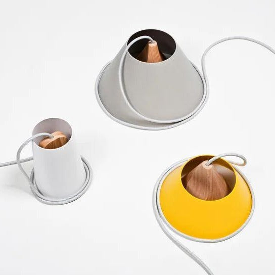 Slope est une série complète de suspensions née de l'idée simple d'habiller l'ampoule. Son corps en bois massif et son abat-jour en métal coloré deviennent une source de lumière essentielle.