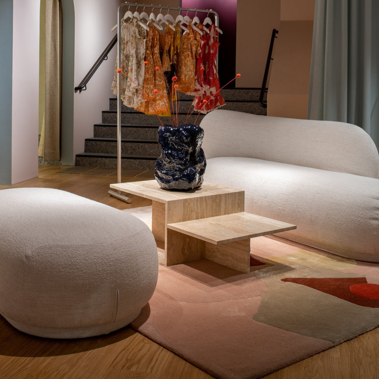 Rosè est un exercice de féminité ludique et ironique, avec ses formes douces et son rose bonbon. Son design, composé de formes douces aux tons champagne, rose poudré, fleur de cerisier, vieux rose, latte et jasmin, contraste avec une touche d'auburn et ce rouge profond qui fait toute la différence.