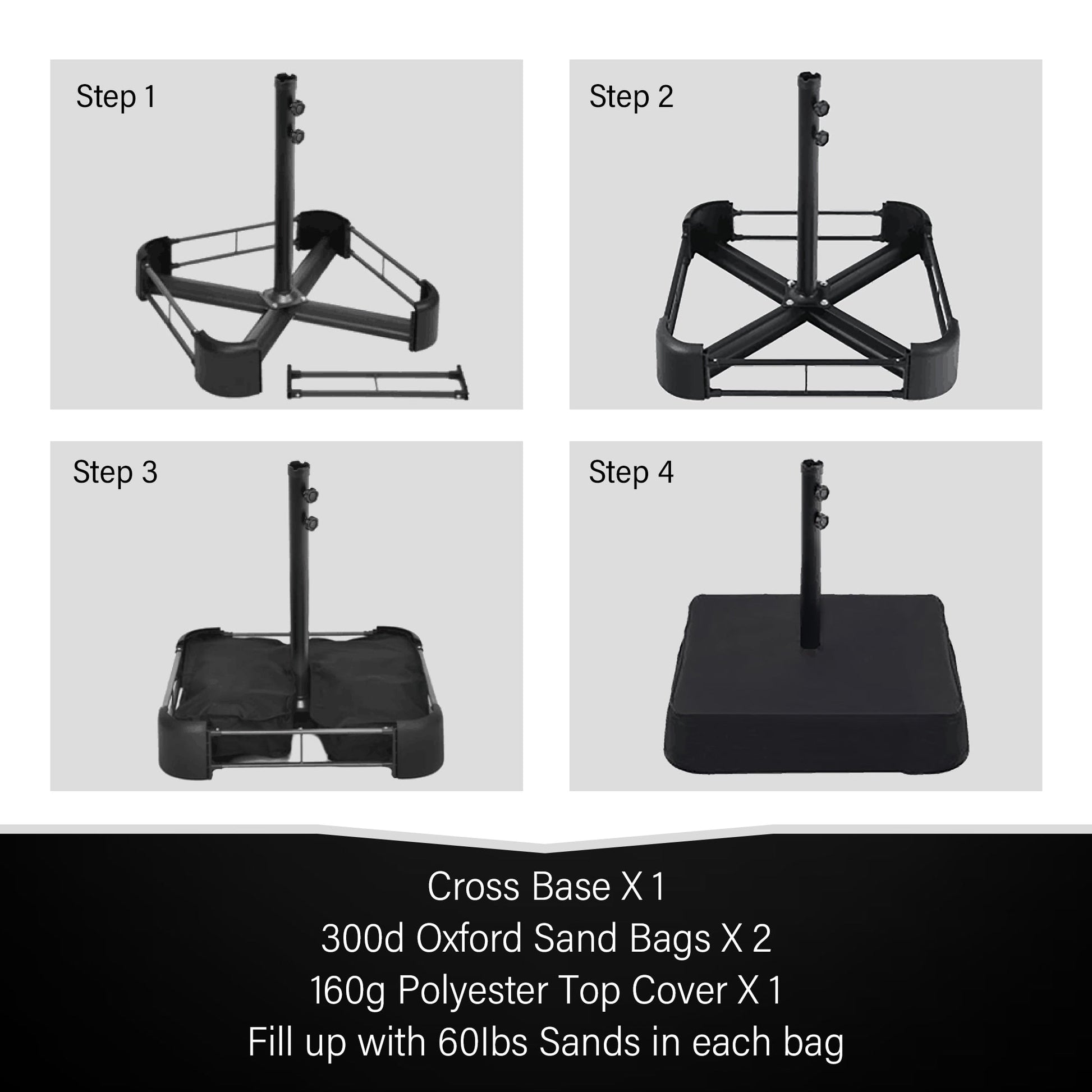 • Base de parasol incluse pour une installation facile : Livré avec une base transversale robuste en acier, deux sacs de sable résistants en tissu Oxford 300D et une housse supérieure en polyester 180G. Nous recommandons d'utiliser 45 kg de sable par sac pour garantir la stabilité.