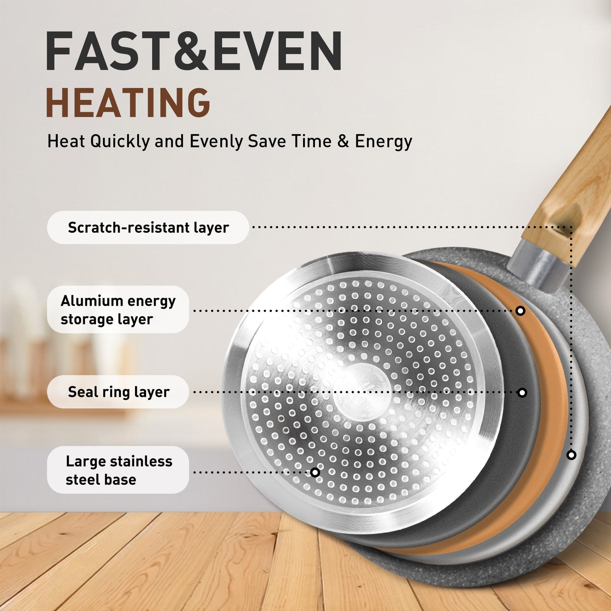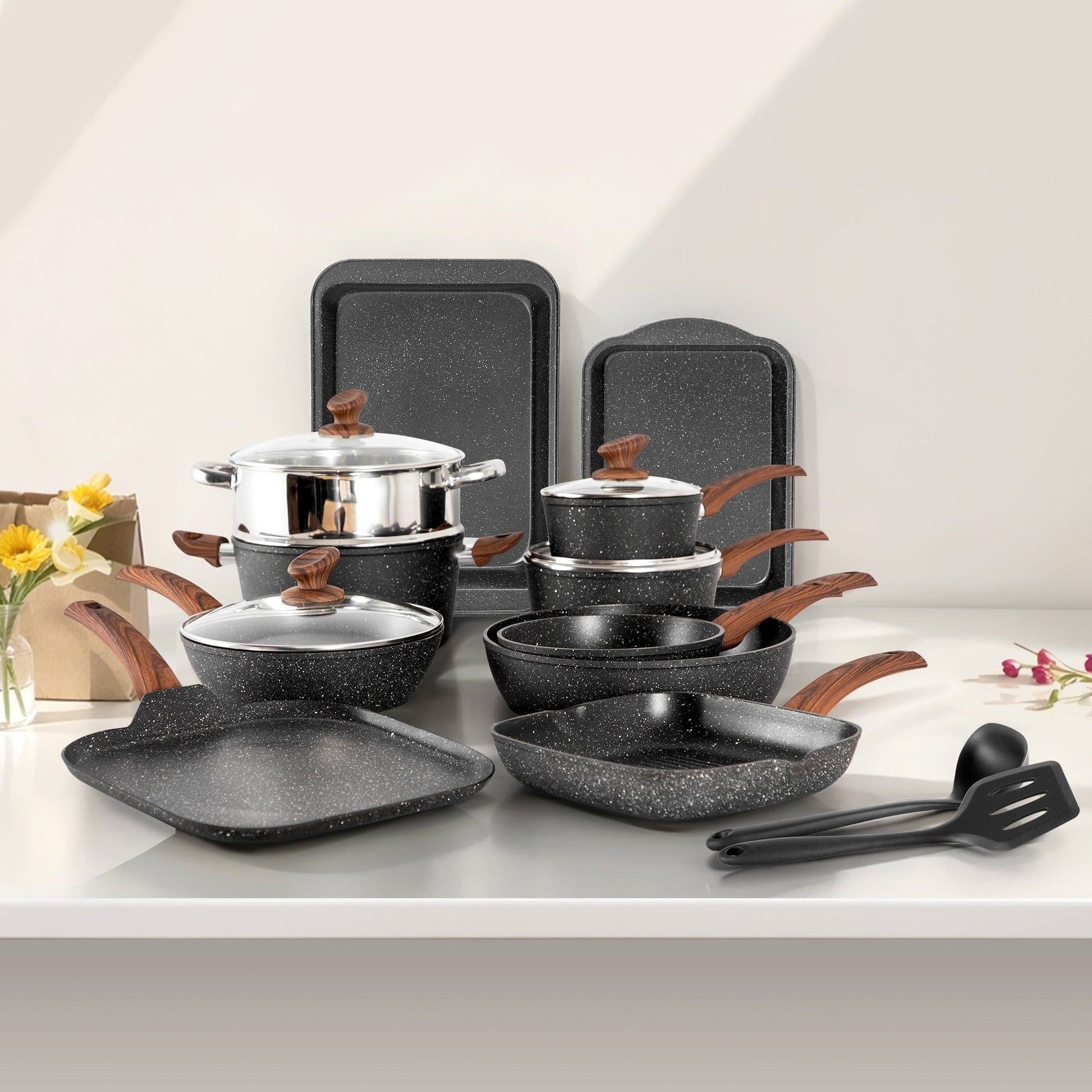 Batterie de cuisine antiadhésive : Lors de l'achat d'ustensiles de cuisine, l'un des critères les plus importants est la qualité antiadhésive. Le revêtement en granit empêche efficacement les aliments d'attacher. De plus, vous pourrez cuisiner des repas plus sains pour votre famille, car vous utiliserez moins d'huile. Vous pouvez cuire de la sauce tomate en toute sécurité dans des ustensiles de cuisine en granit ; le goût et l'odeur de vos aliments ne seront pas altérés, même avec des ingrédients acides ou à forte odeur.