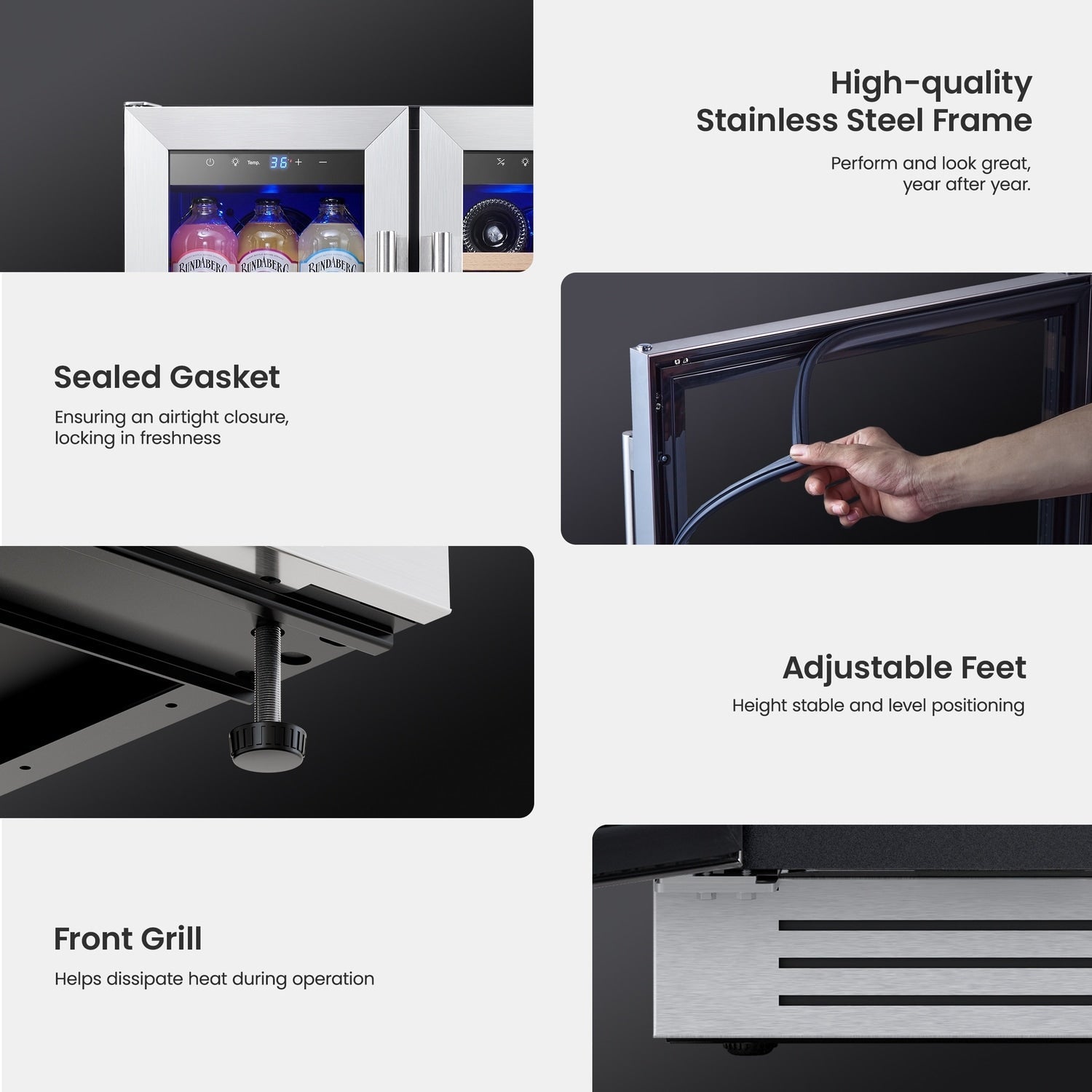 Design sûr et élégant : Le verre résistant aux UV et la construction en acier inoxydable garantissent une durabilité accrue. Ce refroidisseur à vin et boissons s'intègre parfaitement à tout type de décoration intérieure grâce à son design élégant.