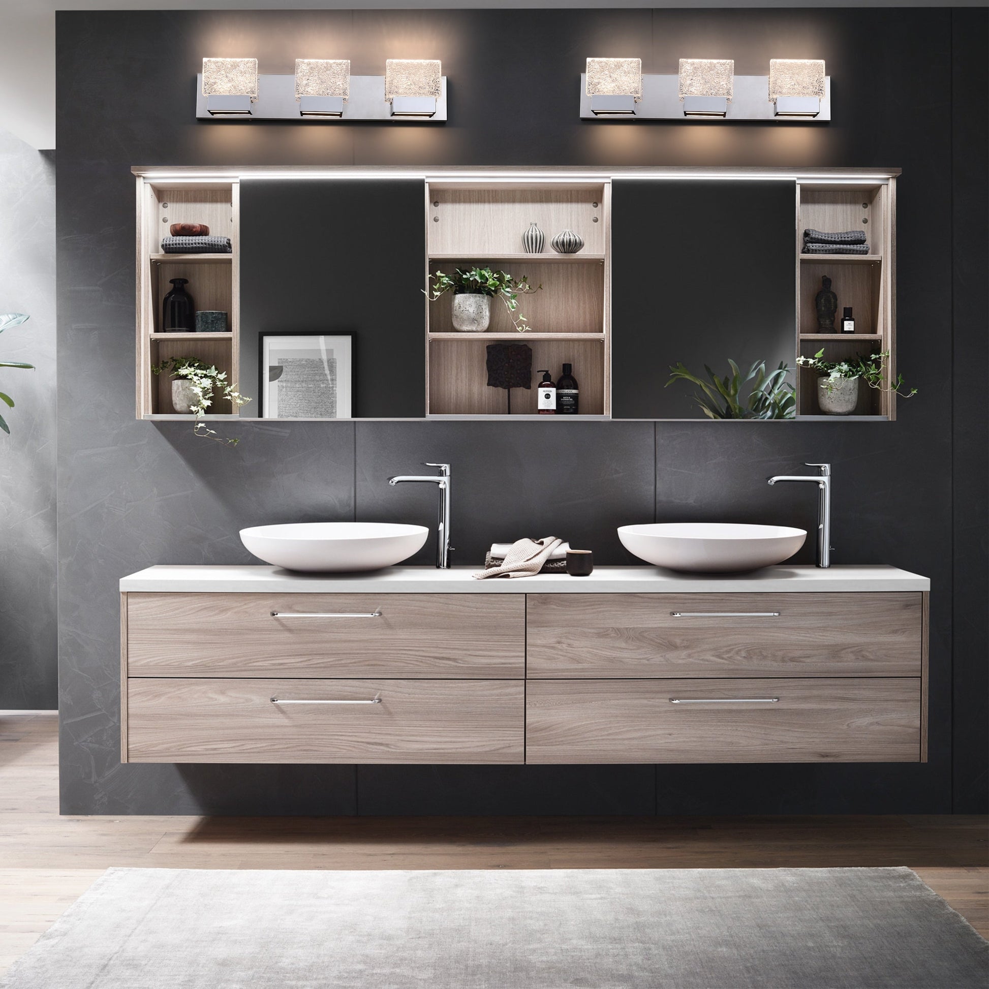Modernisez votre salle de bain avec ce luminaire LED pour meuble-lavabo en acier inoxydable, élégant et économe en énergie, avec ses abat-jour en verre artistique chromé. Les abat-jour en verre artistique transparent effet brique, effet glace, apportent une touche contemporaine qui s'harmonisera avec tous les styles de décoration. Fabriqué en acier inoxydable durable et doté de modules LED intégrés dans un diffuseur en acrylique, ce luminaire sans entretien est idéal pour votre salle de bain.