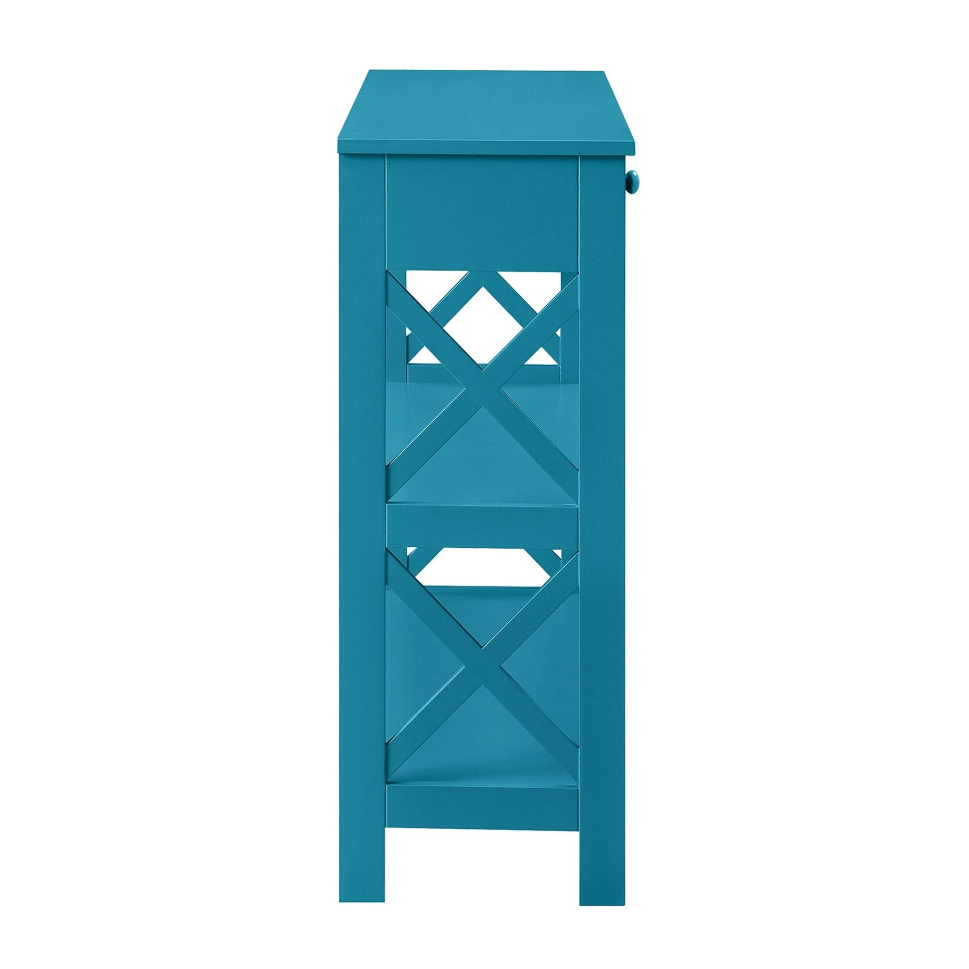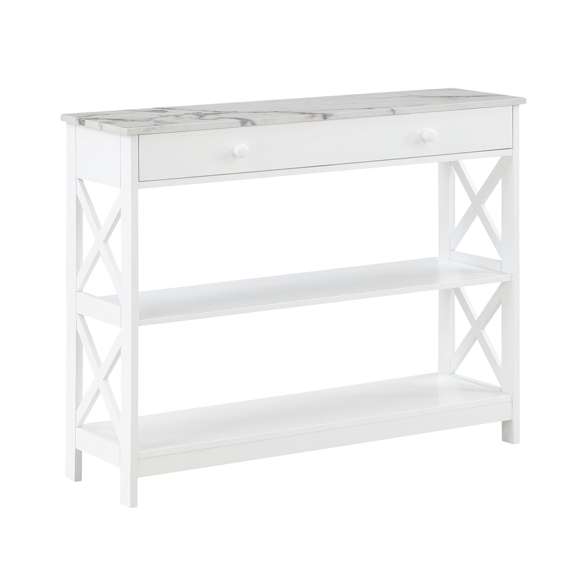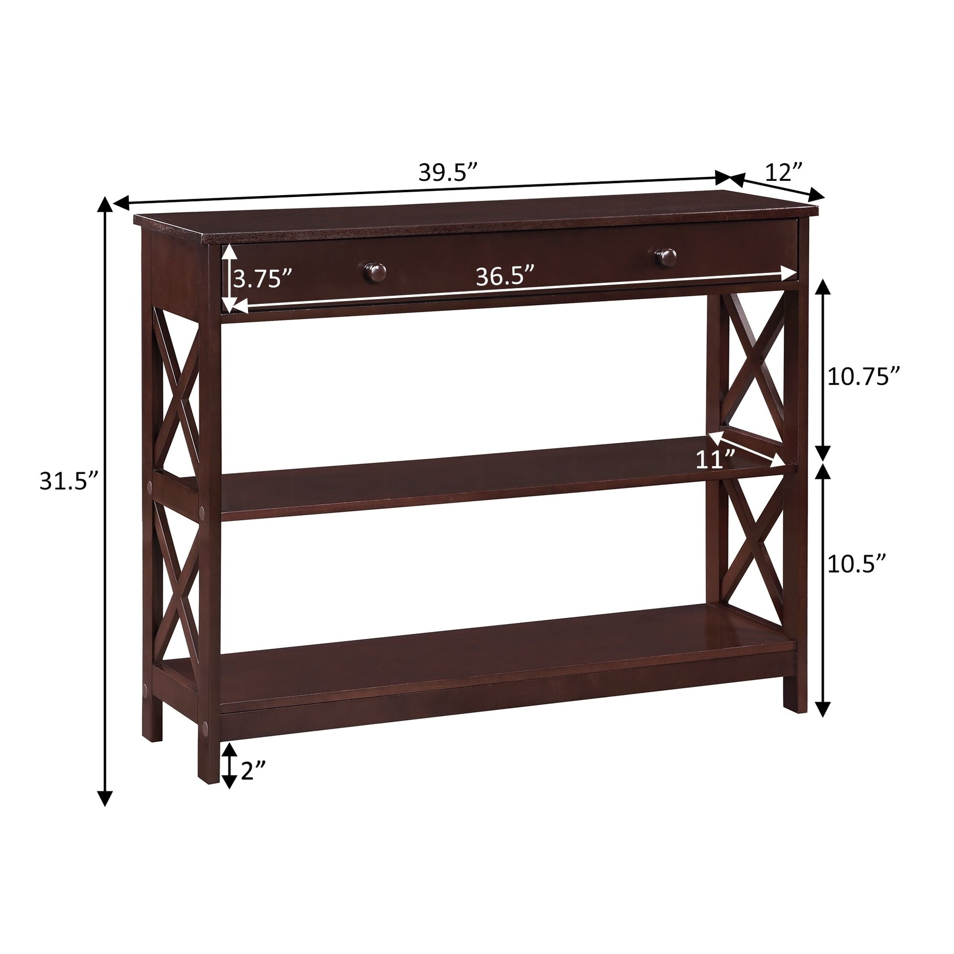 Donnez à votre intérieur une touche d'intemporalité grâce à la console Oxford à 1 tiroir et étagères de Convenience Concepts. Ce meuble transitionnel est doté d'un tiroir coulissant sur glissières à galets et de deux poignées élégantes pour un accès facile. Ce tiroir spacieux offre un espace de rangement généreux pour vos essentiels d'entrée et vos objets du quotidien. Ses panneaux latéraux en X et ses trois niveaux d'étagères font de cette console un objet décoratif idéal à exposer dans n'importe quelle pièce de votre maison. Magnifiquement conçu en MDF, peinture sans plomb et panneaux de particules, ce meuble est conçu pour durer. Complétez votre intérieur avec les pièces coordonnées de la collection Oxford de Convenience Concepts, vendues séparément.