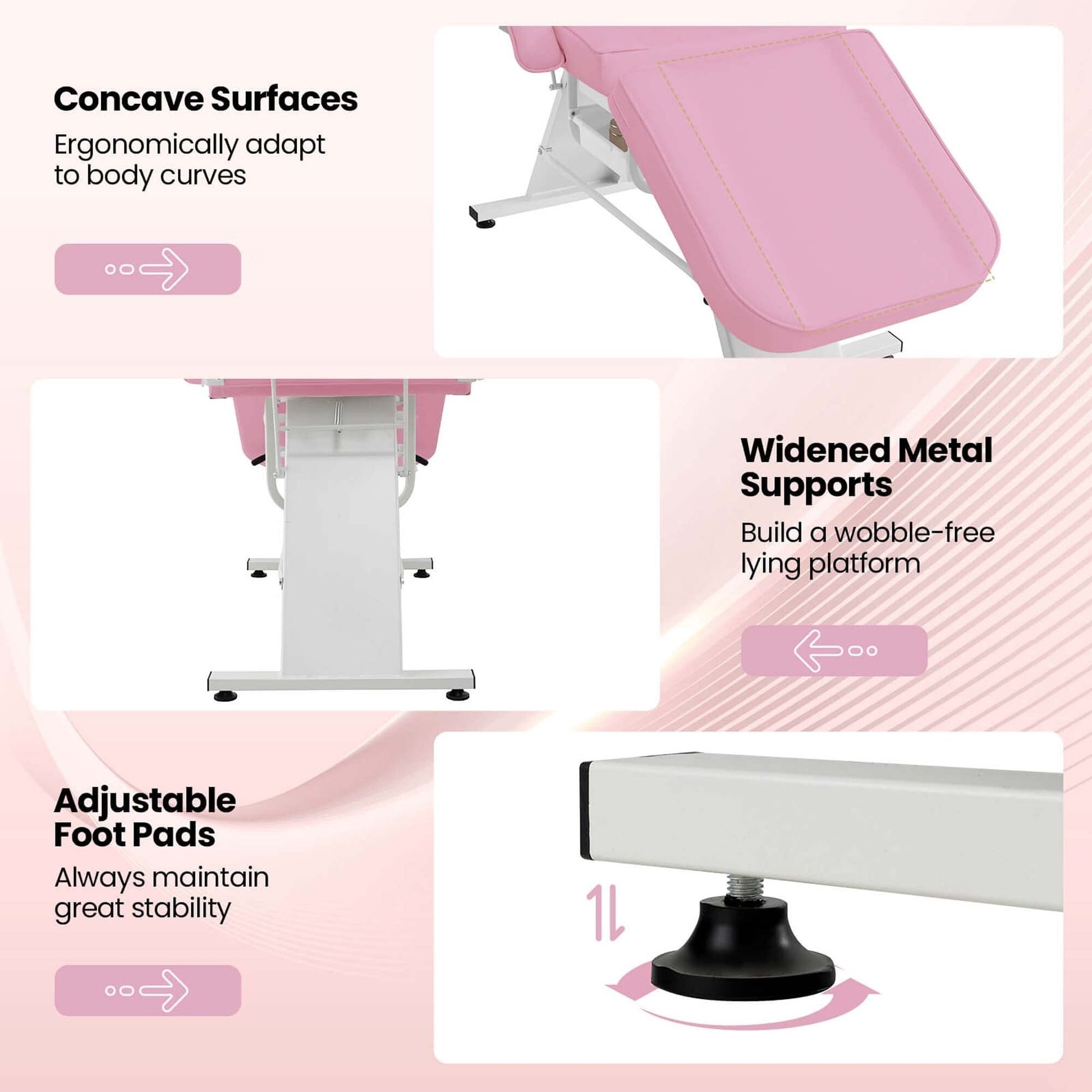 Fonctionnalité Dossier à 7 positions et repose-jambes à 7 positions pour plus de flexibilité Le cuir PVC de qualité supérieure est doux pour la peau, indéchirable et facile à nettoyer Rempli d'éponge haute densité ultra-douce et robuste Tabouret confortable avec un design de rembourrage confortable pour un toucher doux Offre une hauteur réglable pour les personnes de différentes tailles Dispose d'une tige à gaz solide pour soutenir de manière stable le siège pivotant à 360° Livré avec 5 roues universelles, ce qui facilite le déplacement L'oreiller amovible vous permet de trouver un trou de respiration pour le massage La housse de coussin zippée est facilement amovible pour le nettoyage Dispose d'accoudoirs rembourrés amovibles pour se rapprocher des clients pour un meilleur service Deux boîtes de rangement amovibles pour outils, gants, cosmétiques et serviettes Conçu avec des cloisons anti-chute pour maintenir les boîtes de rangement en place Ressorts à haute résilience et levier de réglage à plusieurs vitesses pour un réglage facile Les surfaces concaves s'adaptent de manière ergonomique aux courbes du corps Les supports métalliques élargis créent un effet oscillant