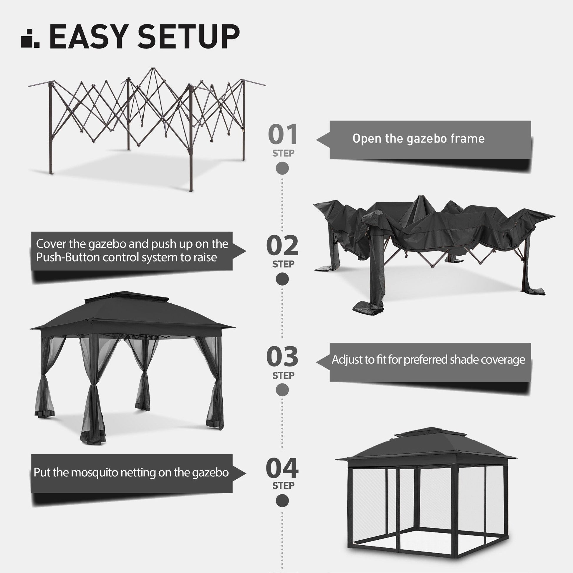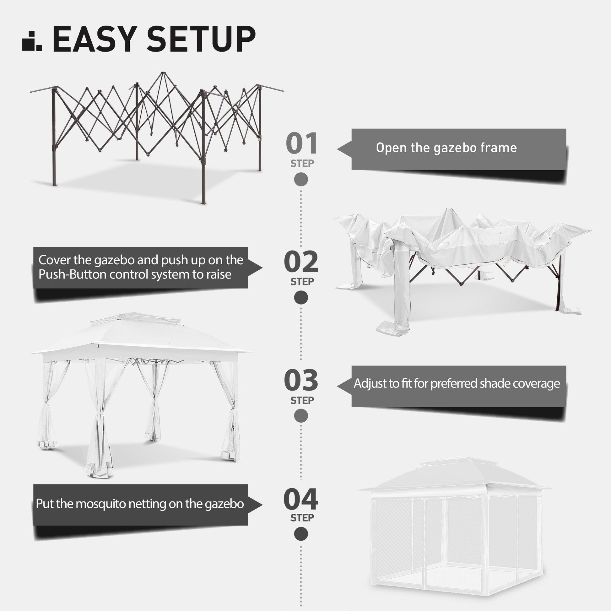 • PAROIS LATÉRALES MULTIPLES - La tonnelle COZYWOR est dotée de parois latérales en filet à fermeture éclair qui offrent une intimité idéale et protègent des insectes. Grâce aux anneaux inclus dans la boîte, vous pouvez facilement fixer les parois latérales à la structure et profiter de vos moments en plein air en toute tranquillité.