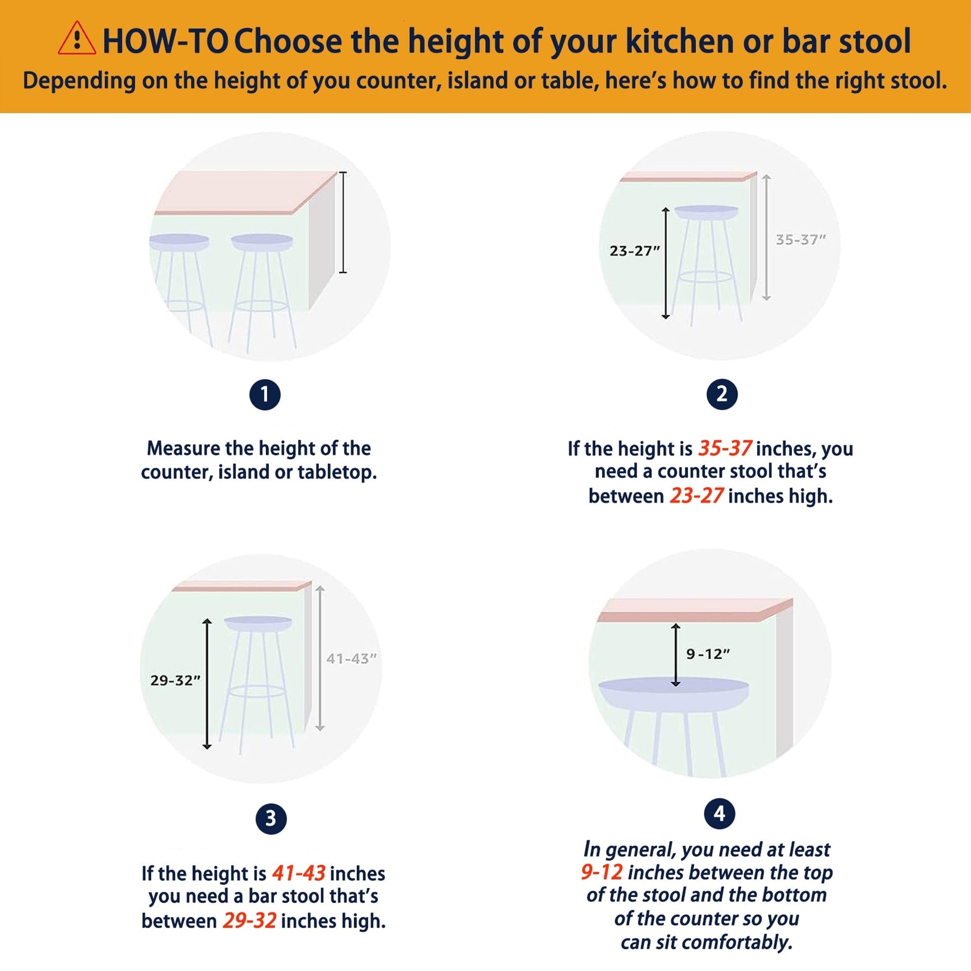 Veuillez d'abord mesurer la hauteur de votre comptoir, îlot ou plateau de table ! Les tabourets de bar conviennent aux comptoirs de 12,5 à 13,0 m de haut et les tabourets de comptoir, aux comptoirs de 10,6 à 11,2 m de haut.