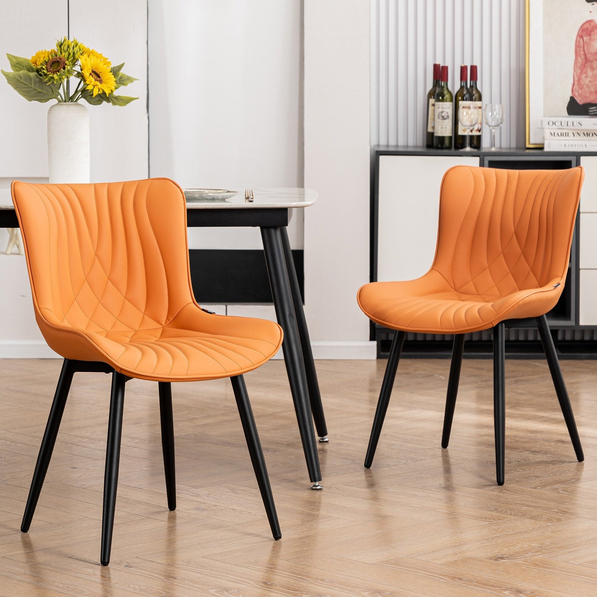 💞 Embellissez votre salle à manger avec un ensemble de chaises qui non seulement dynamisent votre décoration, mais épousent également les courbes de votre corps pour un confort accru. Avec leur jolie bande en queue de baleine, leurs assises en cuir et leur structure en métal robuste pour une durabilité accrue, ces chaises multi-matériaux accentuent leur style contemporain. Sans accoudoirs, nos chaises sophistiquées se glissent facilement dans les espaces vides de la table pour un gain de place optimal et offrent un équilibre parfait entre style élégant et fonctionnalité. Polyvalentes, ces chaises de cuisine et de salle à manger conviennent à une grande variété d'environnements : salles à manger, cuisines, salons, chambres d'amis, salles d'attente et même maisons de vacances. Elles peuvent servir de fauteuils de lecture confortables, de coussins d'angle confortables, de fauteuils de maquillage, de fauteuils de salon, etc.
