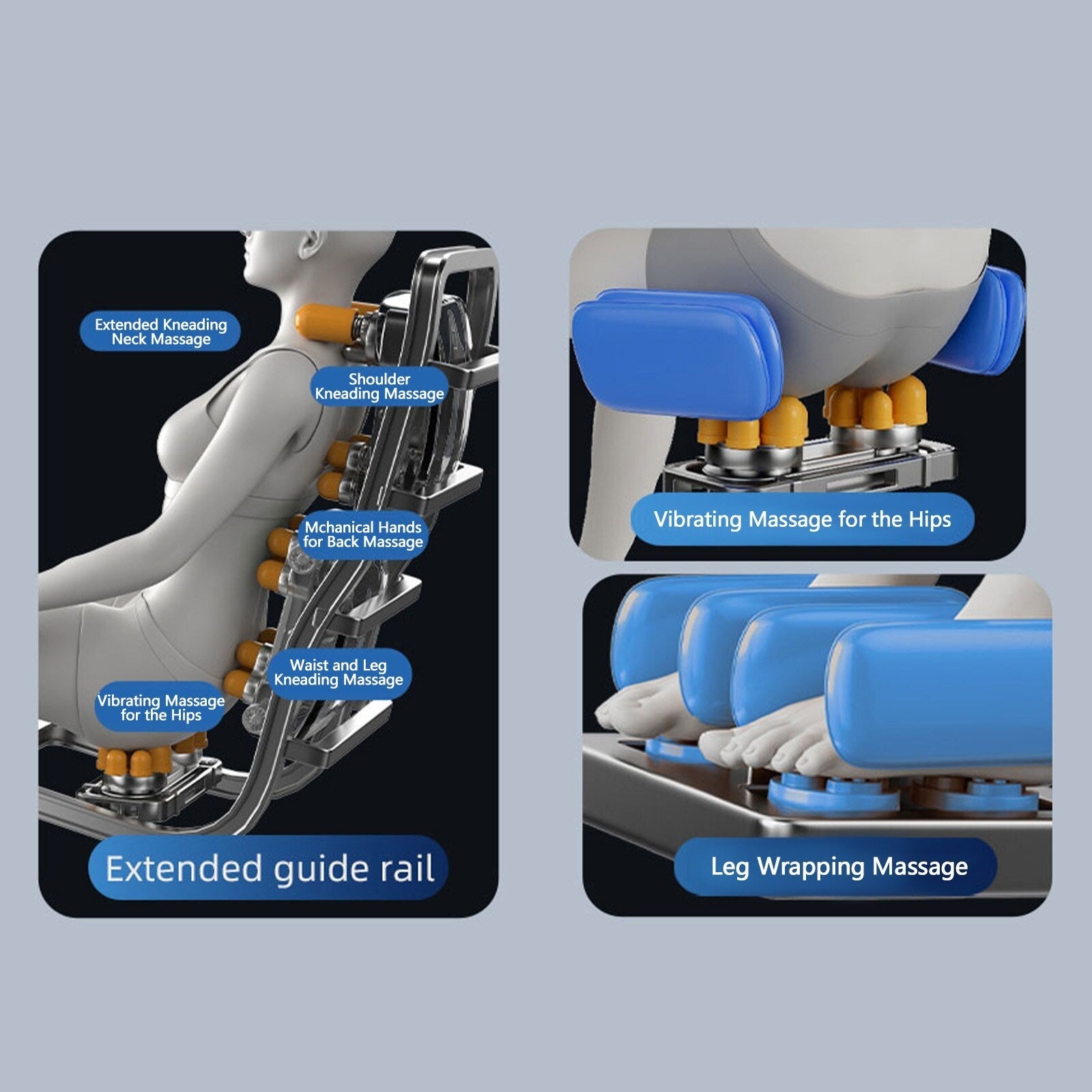 • 8 rouleaux fixes et massage des hanches : doté de 8 rouleaux dans le dossier pour une couverture de massage précise du dos et de la taille, ainsi que de 2 rouleaux dédiés pour le soulagement des hanches.