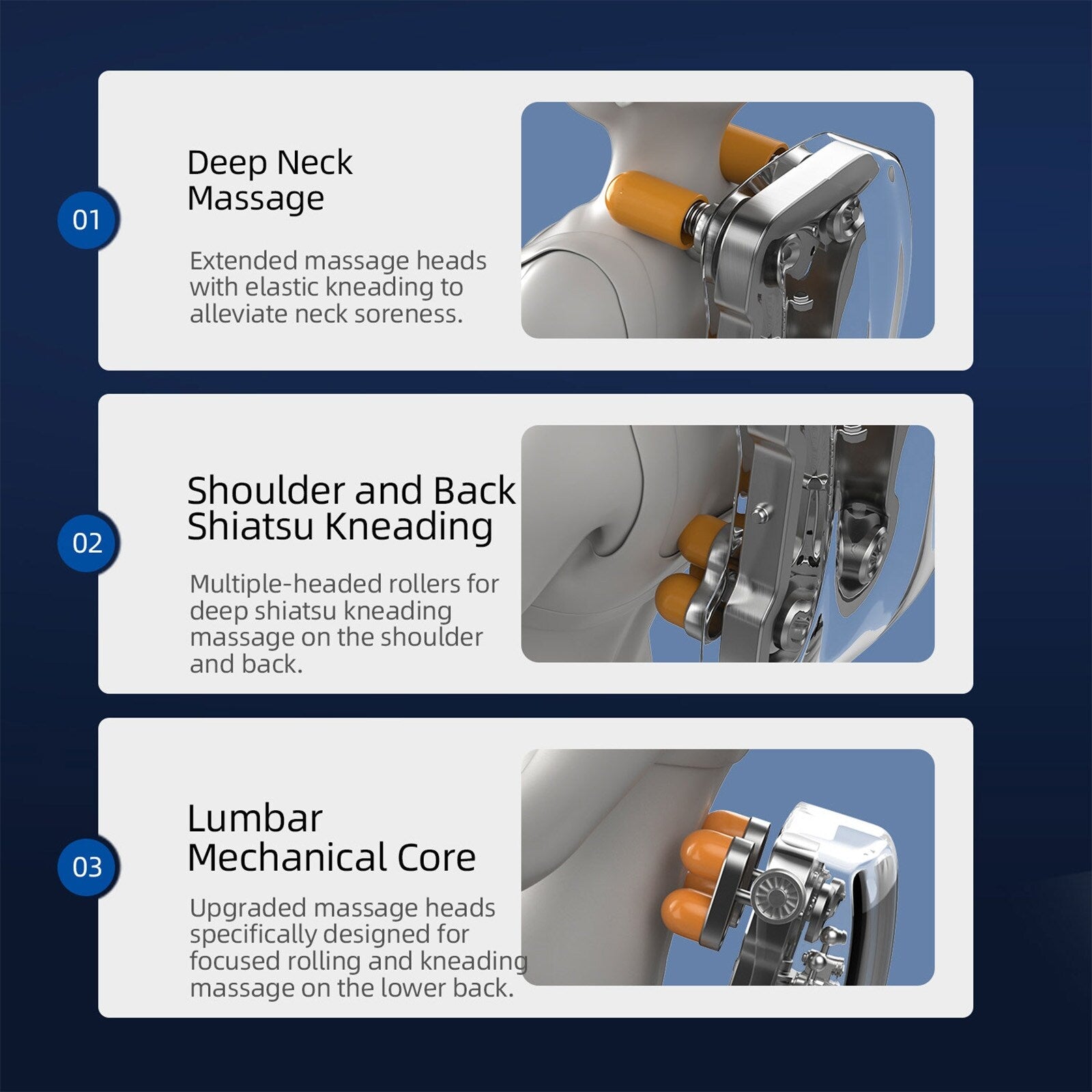 • 5 techniques de massage : Profitez de styles de massage de qualité professionnelle, notamment le pétrissage, le shiatsu, les applaudissements, les tapotements et les coups , adaptés à vos besoins de relaxation.